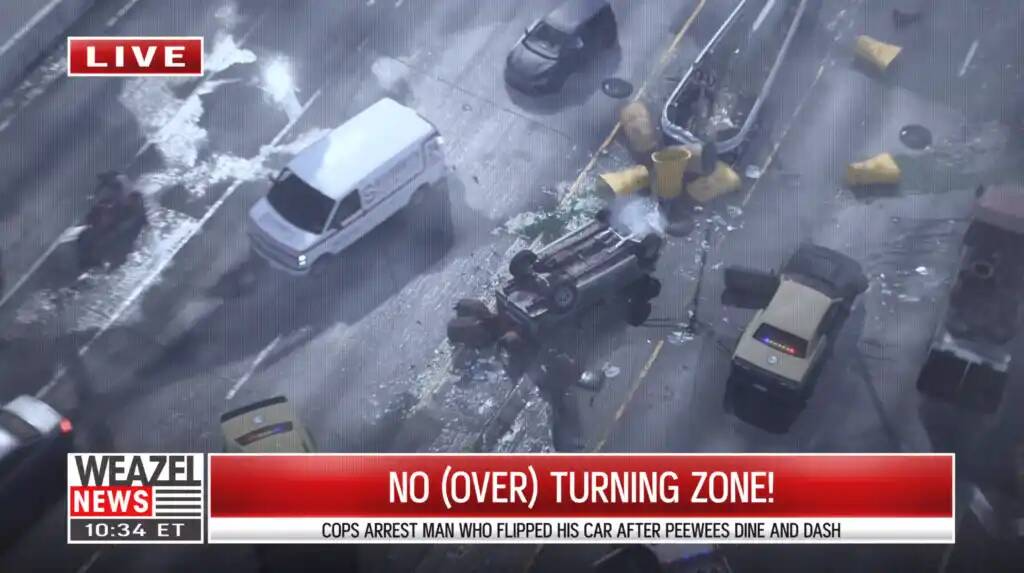 71 - Weazel News, сатирическое представление Fox News в игре Grand Theft Auto (GTA), сообщило в 10:34 об инциденте, связанном с опрокидыванием транспортного средства после того, как водитель сбежал из ресторана, не заплатив.
