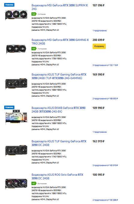 RTX 3090 пока что чуть получше представлены в магазинах, но связано это в первую очередь с изначально завышенными ценами на них. А сейчас феноменальный спрос на любые видеокарты позволил продавцам ещё сильнее задрать цены на эти GPU и требоват за них суммы в районе 180-200 тысяч рублей. Стоит отметить, что даже при такой стоимости их окупаемость займёт всего 9-10 месяцев, что может означать их скорое исчезновение с прилавков.