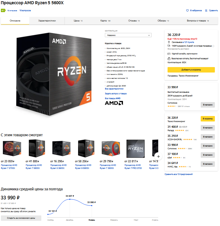 Если обратиться к данным сервиса Яндекс Маркет, то можно обнаружить заметное снижение цены на этот процессор в последний месяц. Если в декабре средняя цена находилась на уровне 34 751 ₽, то сейчас она упала до 33 091 ₽. А в хорошо знакомом вам магазине Регард на 5600х действует дополнительная скидка, снижающая ценник до вполне привлекательных 31 400 рублей.