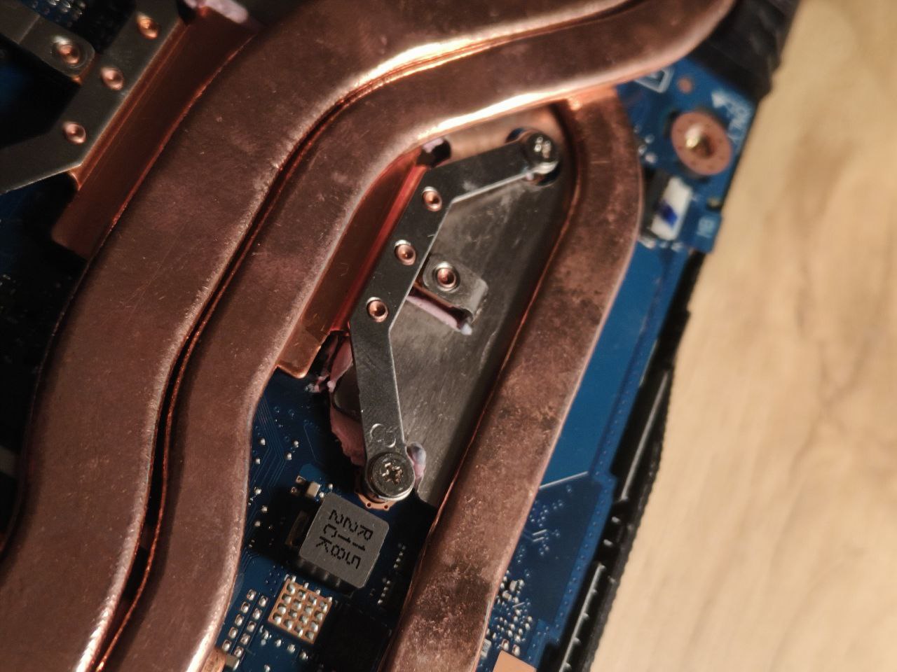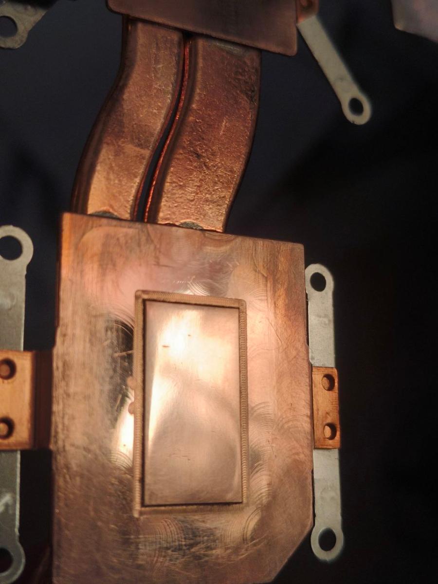 Спустя 2 года эксплуатации (и 3 года от выпуска) термопрокладки остались довольно эластичными. Если присмотреться, то можно заметить, что где-то прокладок пожалели и дросселя не полностью покрыты и прижим был не сильным, а где-то и отсутствовал вовсе. Термопасты не пожалели, так не пожалели. Насыпали столько что чуть на материнку на вылезла.