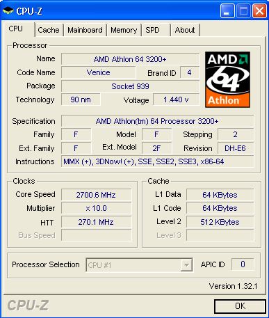 Разница между ними была около 400 рублей, дороже стоил Athlon 64 3200+ ядро Venice. Разгон у всей серии процессоров Athlon 64 ядро Venice практически одинаков, обычно этот предел 2700-2800 MHz, к тому же у Athlon 64 3200+ (10)больше множетель чем у Athlon 64 3000+ (9), что в пользу Athlon 64 3200+, и к тому же производительность по дефолту у 3200 больше. И после некоторых раздумий был преобретен Athlon 64 3200+ ядро Venice не BOX.