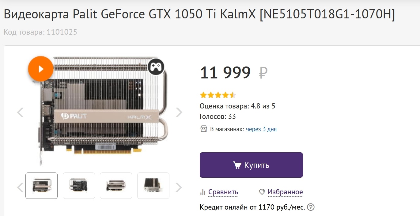 В Регарде я не нашел подходящей видеокарты и отправился в DNS Технопоинт, там нашлась самая мощная в РФ, на данный момент, видеокарта с полностью пассивным охлаждением - Palit GeForce GTX 1050 Ti KalmX [NE5105T018G1-1070H].