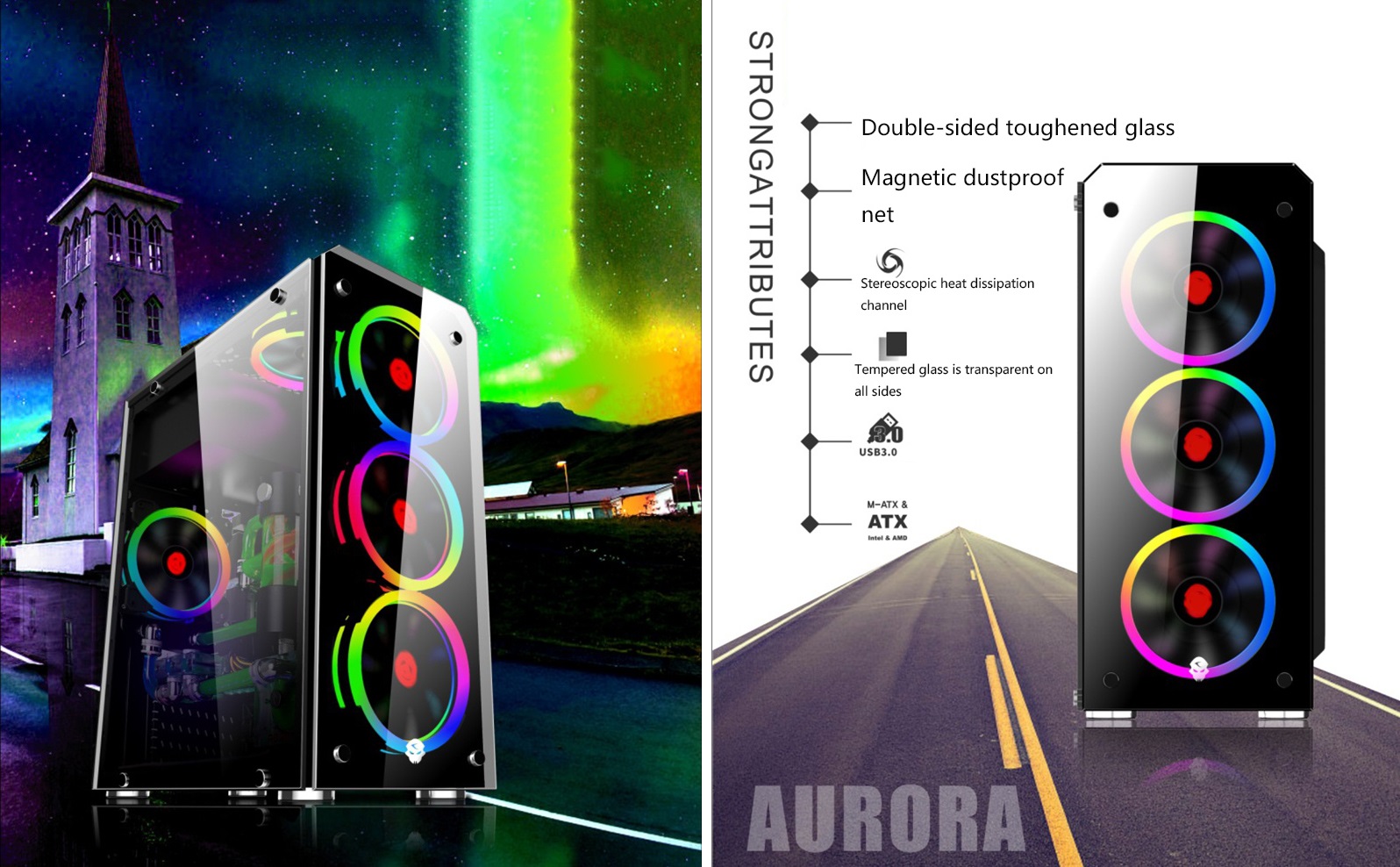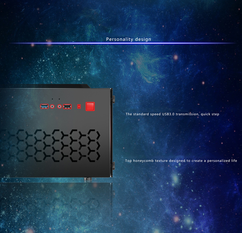 Стильный корпус от компании Aigo. Корпус выполнен из прочной стали и закаленного стекла. Корпус имеет размер 408x210x268 мм.
