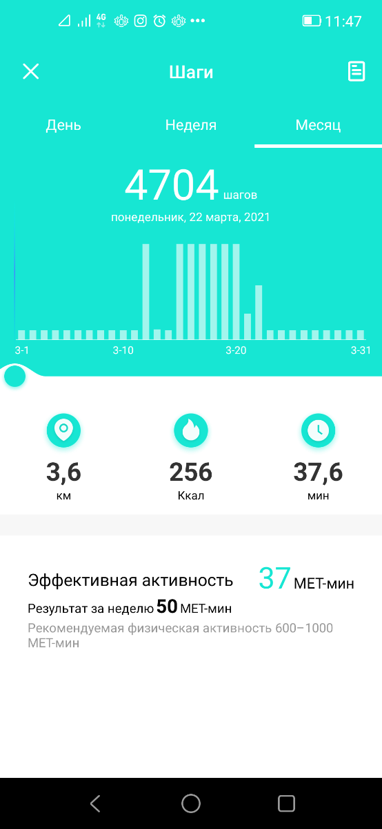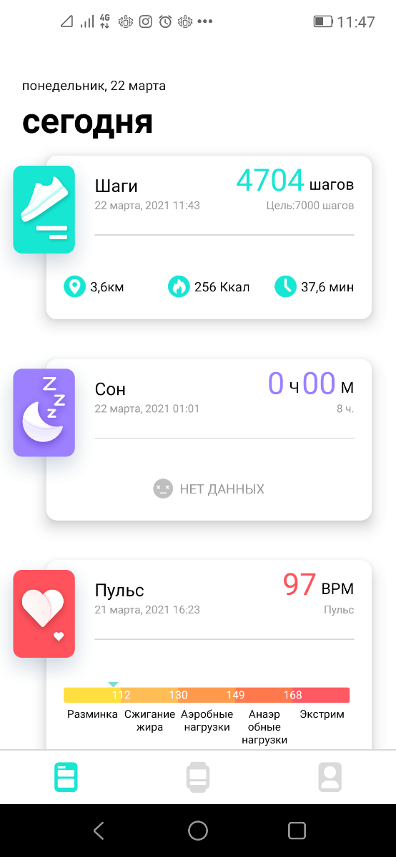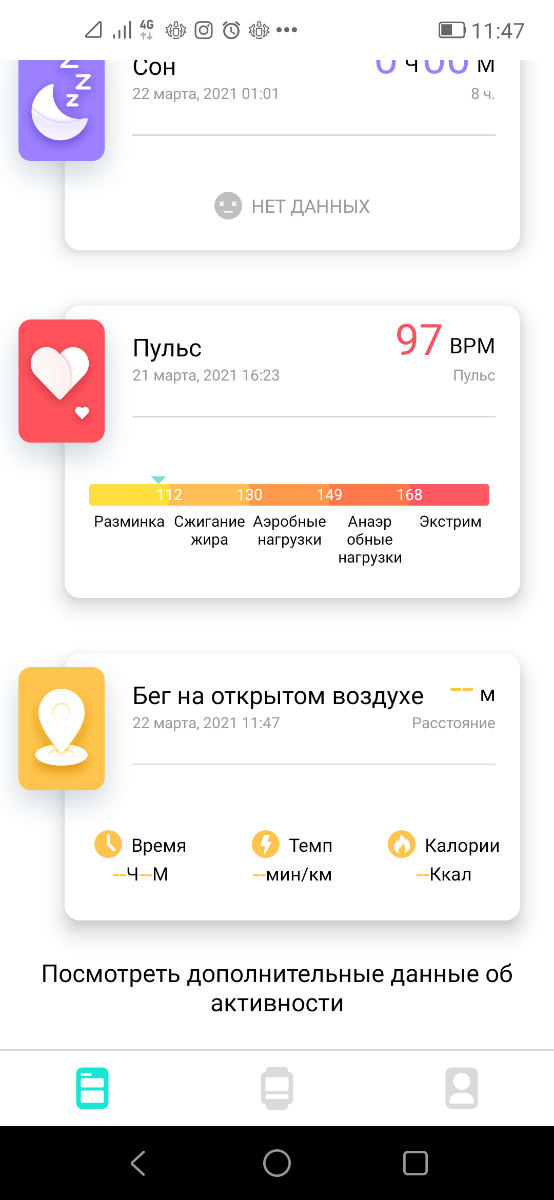 В приложении доступен следующий функционал: просмотр статистики по количеству проделанных шагов, пройденному расстоянию, сожженным килокалориям и времени, проведенному в пути, за день, неделю и месяц, просмотр данных о качестве сна, измерениях пульса. Есть также режим для бега на открытом воздухе, который запускается через приложение и подсчитывает время тренировки, расход калорий, темп в мин/км, шаги и пульс.