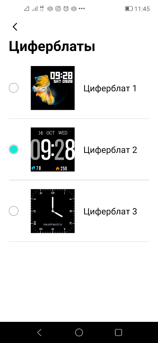 Следующая вкладка позволяет более гибко настроить часы под себя. Можно посмотреть уровень заряда в процентах, выбрать один из трех доступных "циферблатов", включить или выключить на свой выбор уведомления о звонках, SMS и от разных приложений из списка поддерживаемых, задать время для срабатывания будильников (отдельные от будильника на смартфоне, всего можно задать до трёх будильников на разное время). Тут есть своё предельно простенькое приложение для задействования камеры смартфона - на случай, если соответствующая функция смарт-часов не "подружится" со штатным приложением камеры смартфона, а также ряд системных настроек с возможностью выбора формата времени и единиц измерения, установки режима постоянного мониторинга пульса (снизит время автономной работы часов), выбора языка и так далее. Последний пункт в данном разделе - обновление ПО смарт-часов.