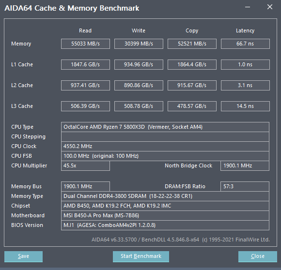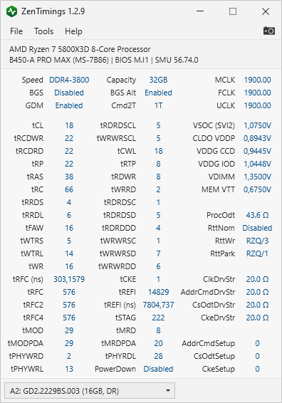 Память - Apacer NOX [AH4U32G36C25YMBAA-2] 32 ГБ с небольшим разгоном до 3800, чтобы быть в сихроне с фабрикой 1900 и настроеными вторичными таймингами. Две планки по 16 двуранговых, на чипах Samsung D-die. Очень бюджетная память, одна из самых дешевых 32 Гб наборов из множества тех, что были в крупнейшем гипермаркете.