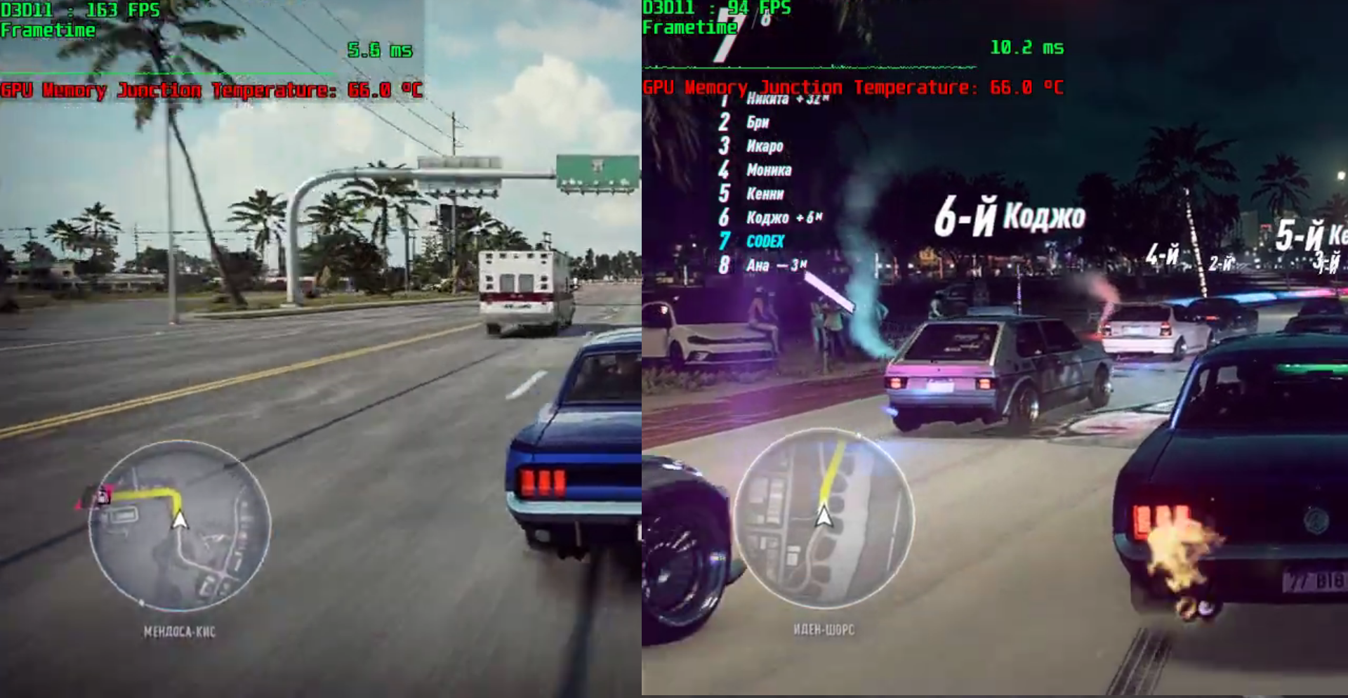 Фпс разница, самый низкий, который наблюдал был 93фпс в самом начале гонки. При свободной езде фпс в районе 130-160.