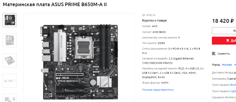 Поскольку указанный выше процессор имеет теплопакет до 65 Вт, то можно было бы купить материнскую плату за 12 тысяч рублей на чипсете В620. Такой выбор кажется логичным только на первый взгляд, но в корне не верен, поскольку никто не знает, будет ли AMD выпускать процессор с таким TDP через несколько лет. Кроме того, вы заранее ограничиваете свои возможности, поэтому мы предлагаем остановиться на добротной материнской плате на чипсете В650. ASUS PRIME B650M-A II не хватает звёзд с неба, но вполне неплохо справляется с задачей обеспечения стабильной работы всего компьютера. Здесь есть все актуальные сокеты, включая М.2, а также присутствует поддержка интерфейса PCIe 4.0. Это позволит нам сразу же купить скоростной твердотельный накопитель, но об этом чуть ниже.