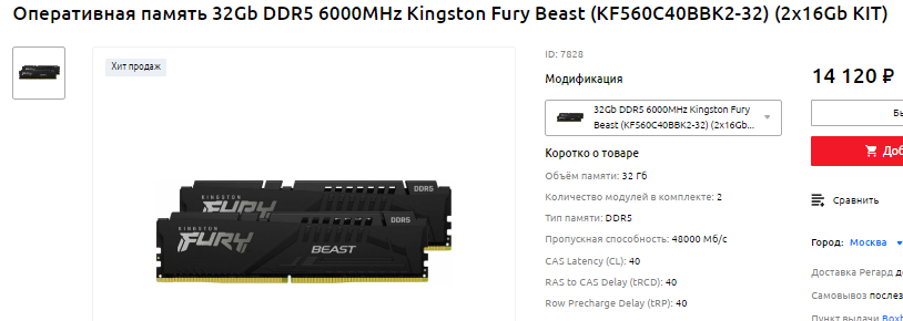 Поскольку оперативная память стандарта DDR5 всё ещё находится в начале жизненного цикла, то мы предлагаем взять столько памяти, чтобы не потребовалось её добавлять через 3 года. Комплект из двух планок Kingston Fury Beast отлично впишется в нашу систему. Он стоит не очень дороги и поддерживает скорость до 6000 МГц. Для того чтобы получить действительно хорошие результаты, достаточно автоматической настройки, доступной в системе BIOS. 32 Гб будет достаточно для любых задач, включая игры, стриминг и просмотр сразу 10 видеороликов. Для разгона лучше взять что-то более солидное, но мы очень сомневаемся, что наши читатели захотят тратить несколько дней на поиск идеальных таймингов.