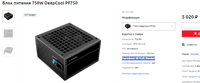 При выборе блока питания нужно учитывать, что мы собираем компьютер под апгрейд. Именно поэтому экономить тысячу рублей глупо, ведь от таких незначительных мелочей зависит стабильность всей системы. DeepCool PF750 не понравится тем, кто привык к элитным блокам питания, но точно придётся по нраву тем, кто ценит лучшее соотношение между качеством и ценой. Мощности в 750 Вт достаточно для данной системы и точно хватит для следующего обновления компьютера. Блок питания поддерживает сертификат 80 PLUS Standard. Хотелось бы больше, но в данном случае важнее стабильность и попытка не переплатить лишние деньги, чем мнимая энергоэффективность.