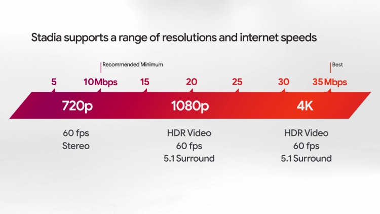 - по официальным данным предоставленным компанией Google, для игры в разрешении 4K вам потребуется канал шириной в 35 Мбит/с, а для игр в разрешении 1080р хватит и 20 Мбит/с, минимальные же требования к интернет-соединению начинаются с 10 Мбит/с.