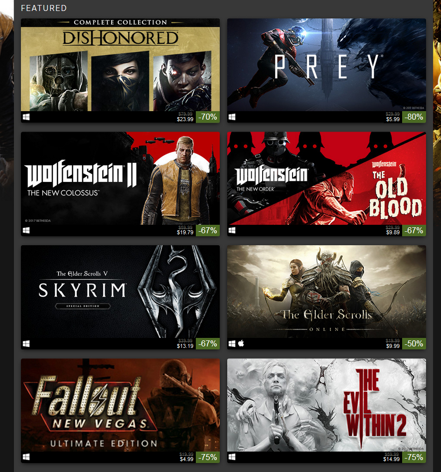 Только представьте: DOOM за 263 рубля! Wolfenstein II: The New Colossus за 659 рублей. The Elder Scrolls Online всего 399 рублей. Fallout: New Vegas Ultimate Edition - каких-то 107 рублей. Prey — 199 рублей. И это далеко не все. Например, Dishonored: Complete Collection можно отхватить за 809 рублей, а RAGE 2 за 999 рублей. Распродажа начнется 25 июля, а закончится 30 июля. Как замечают организаторы распродажи, не торопитесь, игровых кодов хватит на всех. Было бы только у вас желание и возможность их купить. Ясно, что такая немыслимая щедрость не могла пройти незамеченной. Пользователи, как всегда, разделились на тех, кто рад подобным распродажам и тех, кто злобно ворчит, обвиняя дядюшку Гейба во всем смертных грехах.