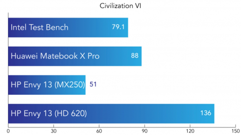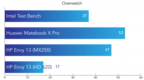 Для сравнения были выбраны несколько других ноутбуков: HP Envy 13 и Huawei MateBook X Pro. К слову, некоторые результаты не совсем репрезентативны, поскольку на других ноутбуках установлена видеокарта NVIDIA GeForce MX250. Но, как видите, даже эта деталь не смогла склонить чашу весов в их сторону. И только в игре Overwatch, один из ноутбуков вырвался вперед нашего испытуемого, что объясняется дискретной видеокартой GeForce MX250. Больше информации смотрите здесь.