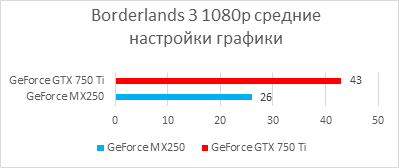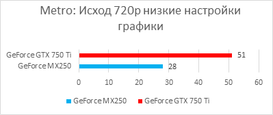 MX250 почти не подкачал. Кстати, в разрешении 720р на средних настройках графики он показал играбельные 37 fps. GTX 750 Ti справился без проблем, но уже на высоких настройках графики он проседает до 22 fps.