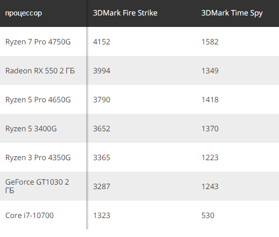 Не менее интересно сравнить интегрированную графику обоих процессоров с дискретной видеокартой Radeon RX 550, имеющей объём памяти в 2 Гб. Если сравнивать напрямую с Core i7-10700K, то его результат в более чем три раза уступает бюджетной дискретке, а вот GPU на Ryzen 7 Pro 4750G способно не только побороться с дискретной картой, но и обойти её в тестах 3DMark Fire Strike и 3DMark Time Spy.