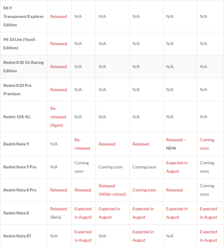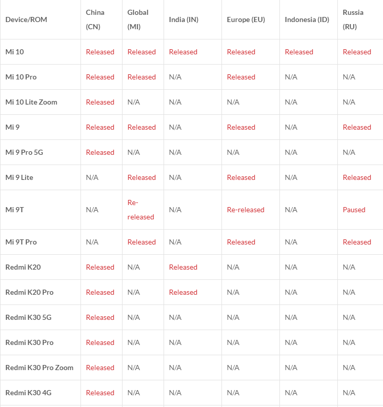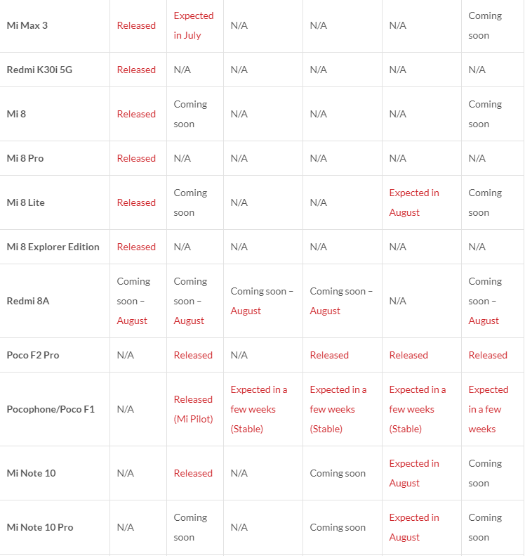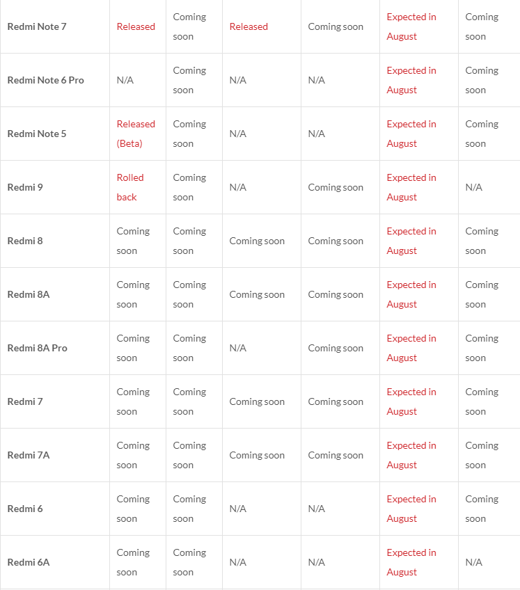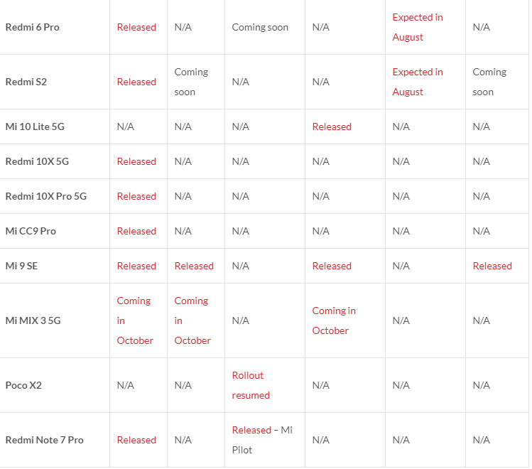 Список перед вами. N/A означает, что дата не определена. Released – прошивка вышла. Coming soon – появится до конца месяца. Остальные условные пометки ясны.