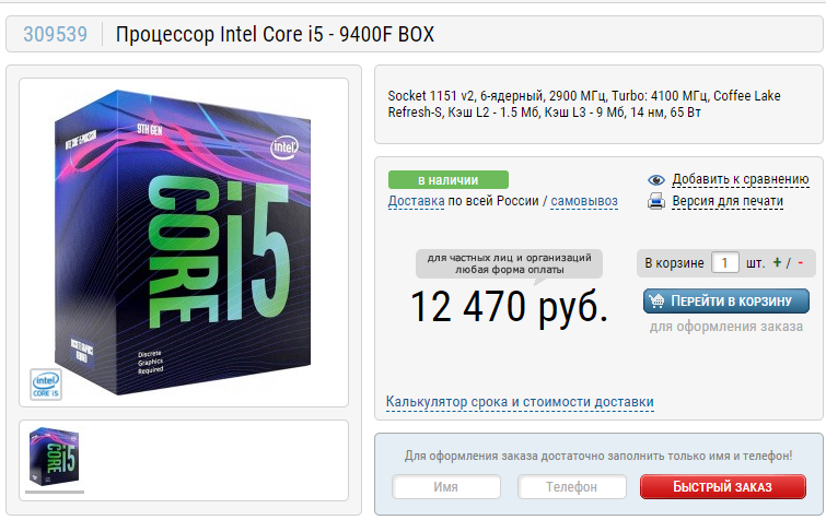 Процессор. Core i5-9400F. Если вы не планируете заниматься рендерингом видео в формате 8К, то покупка дорогого мощного процессора окажется лишней тратой денег. Данный процессор имеет шесть полноценных ядер и демонстрирует отличную производительность в играх. Для разрешения 4К лучше присмотреться к более дорогой сборке, но это заставит вас потратить в несколько раз больше, а ведь мы с вами собираем в первую очередь оптимальный компьютер.