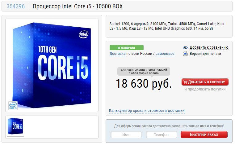 Курам на смех. Core i5-10500. Кто в здравом уме купит этот процессор? Подумайте сами: за 18 630 рублей мы получаем невнятный камень с максимальной тактовой частотой 4500 МГц. На 2 тысячи дороже великолепный Core i5-10600KF, который значительно быстрее в играх за счёт более высокой тактовой частоты (до 4800 МГц), не говоря о том, что он отлично разгоняется. И вообще – он разгоняется, ведь Core i5-10500 этого просто не умеет. На 5 тысяч дешевле разместился Core i5-10400F, который демонстрирует ту же производительность, что и более дорогая модель. Крайне странный процессор, причин для покупки которого, просто нет.