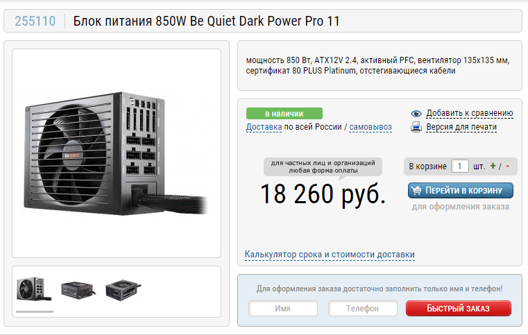 Блок питания. Be Quiet Dark Power Pro 11 на 850W. Блок питания – просто мечта. Он имеет ряд недостатков, например, даже при минимальной нагрузке вентиляторы не останавливаются. Однако качество и платиновый сертификат за красивые глазки не дают. Я не планирую собирать чересчур прожорливый компьютер, поэтому наш блок питания будет всегда работать в слегка расслабленном состоянии.