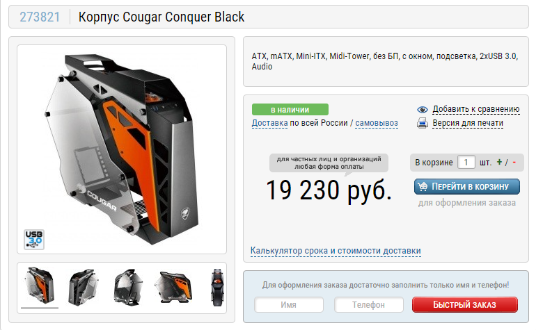 Корпус. Cougar Conquer Black. Обычно я держу свой системный блок под столом. Но будь у меня такое чудо, обязательно поставил бы его посреди рабочего места. Системник выглядит необычно, с приятной дизайнерской ноткой, он вместительный и позволяет видеть все комплектующие, которые будут светиться, как новогодняя ёлка. Я точно не уверен, имеет ли он продуманную систему охлаждения, но отказать себе добавить его в сборку я не смог.