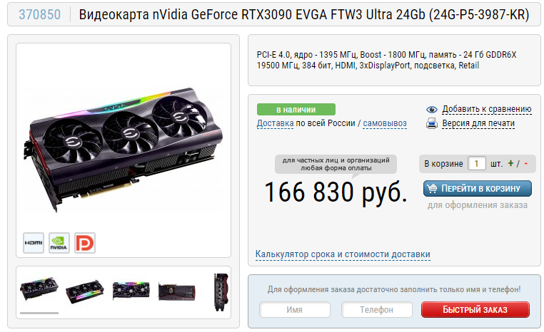 Видеокарта. GeForce RTX3090 EVGA FTW3 Ultra. Я решил, что две видеокарты – это уж слишком. Перед нами одна из самых скоростных моделей на рынке. Только подумайте, здесь целых 1800 МГц тактовая частота графического процессора. Буст более чем на 100 МГц с завода. В остальном – это быстрая, и массивная карта с красивой подсветкой, качественными конденсаторами и немалым аппетитом к питанию. К счастью, я всё предусмотрел, поэтому с последним у нас проблем не возникнет.