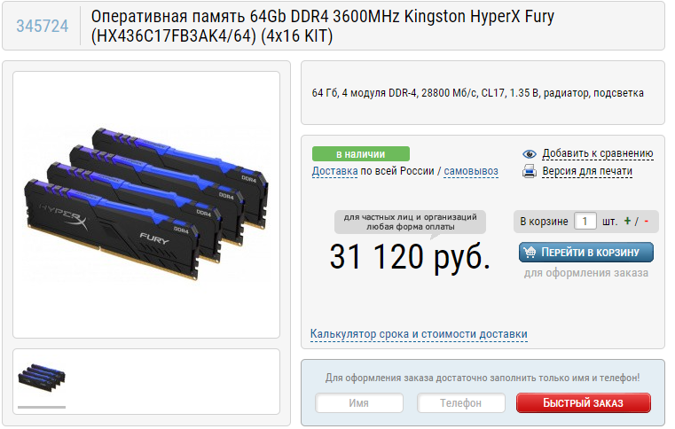 Оперативная память. 64Gb DDR4 3600MHz Kingston HyperX Fury. С этим лотом я решил долго не думать. Мне кажется, что времени подбирать лучшие настройки у владельца данного ПК не будет. Именно поэтому он ограничится наиболее эффективной предустановкой. Главное же – это немалый объём и отличные тайминги прямо с завода. Не обошлось без подсветки, радиаторов и 60 месяцев гарантии.