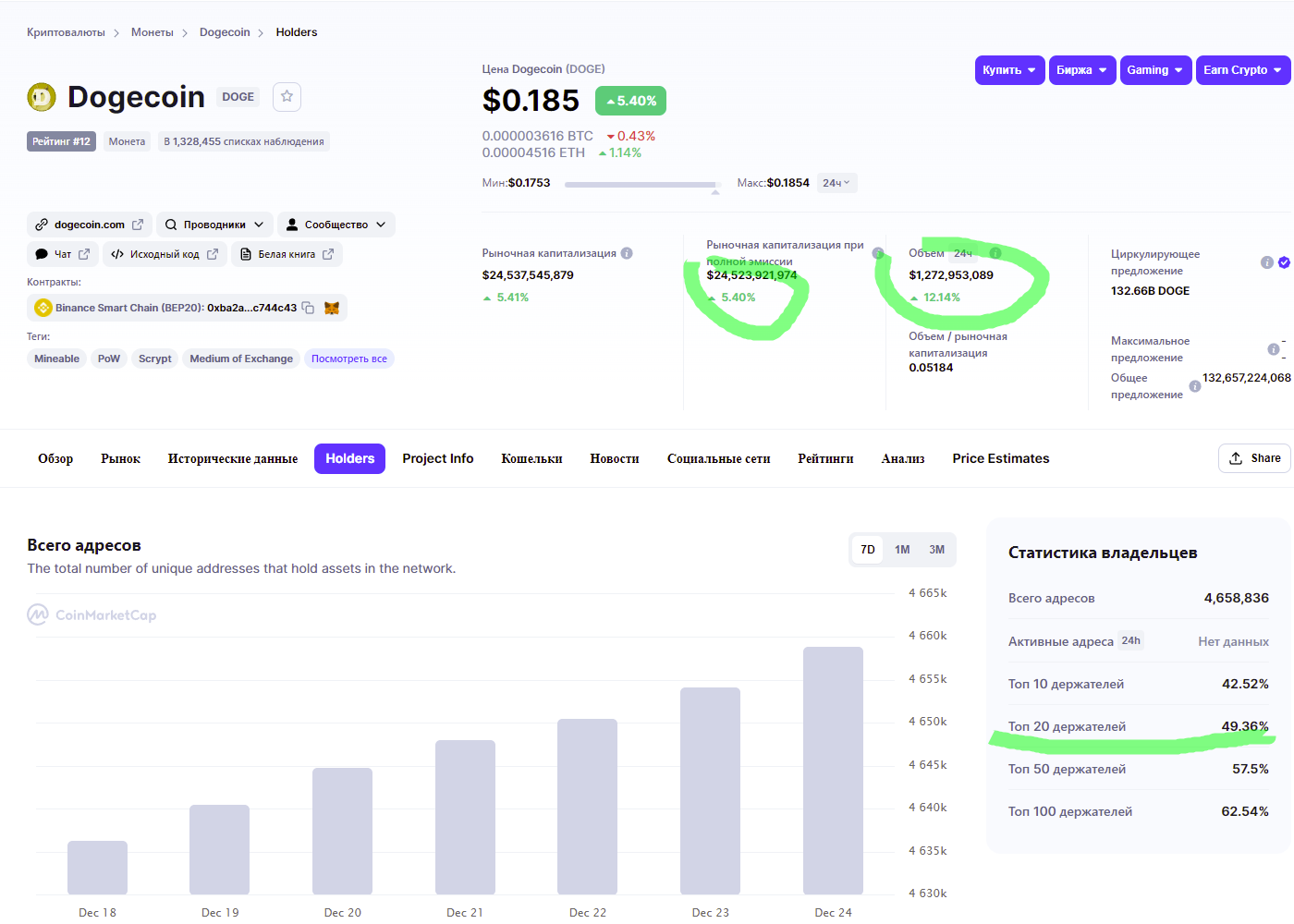 На самом деле всё это не согласуется с реальным положением дел, ведь на 20 различных кошельках лежат более 49% всех монет. Это значит, что половина всех находящихся на рынке цифровых собак являются собственностью нескольких неизвестных, которые владеют миллиардами долларов, получая огромную прибыль. Взгляните на изображение ниже, где указана не только цена всех находящихся на рынке монет, но и объём суточных торгов, который за последние сутки увеличился на 12%. Подобные противоречия ставят в тупик, поскольку в данном случае слова о народном токене оказываются явной ложью.
