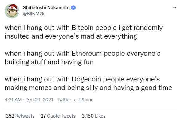 Мало того, когда Илона спросили об его отношении к Биткоину, то он тут же заявил, что это криптовалюта для богатых, которая дала очередной инструмент контроля обеспеченным людям. Сегодня утром высказаться о положении криптовалют в обществе решил создатель Догикоина. По его словам, общаясь с людьми, которые владеют Биткоинами, он испытывает постоянный дискомфорт, агрессию, а иногда и оскорбления. Владельцы Эфира более открыты. Они предпочитают веселиться и проводить время в тусовках. Что до владельцев Догикоинов, то эти ребята только и делают, что создают мемы, ведут себя по-детски и в целом выглядят более счастливыми, чем держатели других криптовалют.