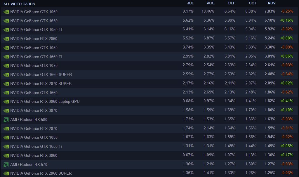 На сладкое – видеокарты. Мы знаем, что это больная тема для многих наших читателей, что доказывает статистика Steam. Уже много лет на первом месте старушка GeForce GTX 1060. Следом идут такие же медленные модели, а надежда всех геймеров (GeForce RTX 2060) оказалась большим разочарованием. В конце 2020 года NVIDIA прекратила её производство, потом снова возобновляла, но в малых количествах, а в итоге на рынке нет видеокарты, способной предложить высокую производительность в народном разрешении 1080р. Эту роль пытается взять на себя линейка GeForce GTX 1660, но недостаток производства таких моделей привёл к завышенным ценам.