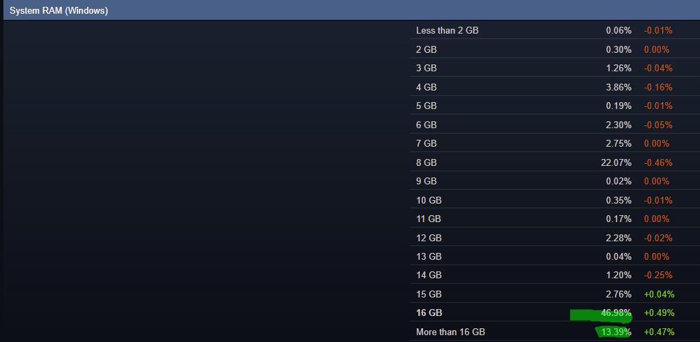 31 декабря – это самое лучше время для подведения итогов года. Сегодня мы рассмотрим наиболее важные показатели, которые волнуют каждого геймера. В качестве источника обратимся в статистику игрового магазина Steam. Прежде всего рассмотрим количество оперативной памяти. 47% всех геймеров имеют компьютеры с 16 Гб оперативной памяти. Этот факт не может не радовать, ведь есть ещё 13% пользователей, с более внушительным количеством ОЗУ. Это гарантирует высокую скорость обработки данных, а значит данная часть компьютера не является слабым местом у большей части геймеров.