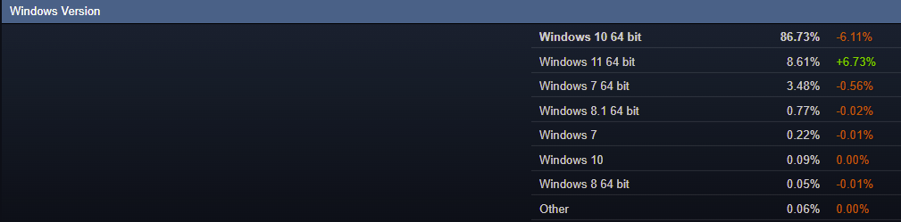 Почти 87% всех геймеров сидят на настольной операционной системе Windows 10. В ноябре новая Windows 11 отвоевала немалую долю и на момент написания данного материала установлена на более чем 8.6% всех пользователей игрового магазина Steam. Устаревшие системы почти не используются, поэтому можно констатировать, что большая часть геймеров имеет потенциальную возможность запускать все современные игры.