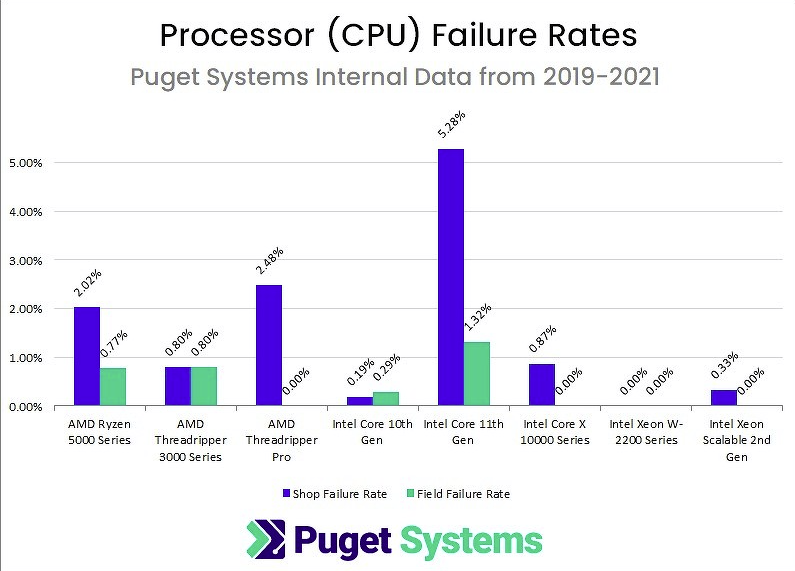 Гарантом надёжности стала серия процессоров Xeon Scalable второго поколения, процент отбраковки в которой составил 0.33%. Это один из лучших показателей, свидетельствующих о зрелости производственных мощностей и продвинутых технологиях Intel. Существенно отстают процессоры Ryzen 5000-й серии. По данным Puget Systems, продукция AMD имеет разочаровывающие 2% брака. Мало того, ещё 0.77% нашли незначительные проблемы, которые не вошли в основную статистику. Но главный антирекорд принадлежит линейке Intel Core 11-го поколения. Здесь процент брака доходил до 5.28%, к которому следует прибавить ещё и 1.32% во время выполнения рабочих задач. Если сравнивать с показателями десятого поколения (0,19%), то можно говорить о настоящей катастрофе. Эксперты полагают, что дело в слишком высоких тактовых частотах, что негативно сказалось на температурном режиме процессоров.