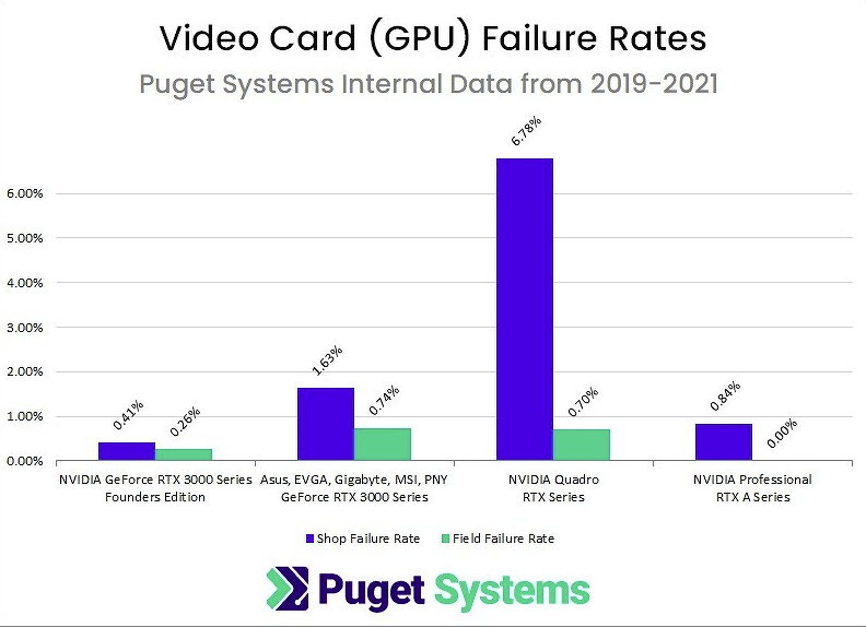 Как оказалось, Puget Systems наотрез оказывается работать с продукцией AMD, поэтому статистики по этой компании нет. А вот с NVIDIA всё в полном порядке. Сообщается, что видеокарты GeForce RTX 3000-й серии имеют минимальный процент брака, но самые надёжные карты выпускает сама NVIDIA. Речь об эталонных версиях, которые имеют максимально сбалансированное охлаждение и включают наиболее дорогие и качественные компоненты. Процент отказов по уже проданным картам составил 0.26% и ещё 0.41% видеокарт были отбракованы ещё до установки их в системные блоки. А вот серия Quadro RTX продемонстрировала ужасающие 6.8% брака. Оказывается, всё дело в дефектном порте VirtualLink (USB-C), который сильно подпортил статистику данной серии.