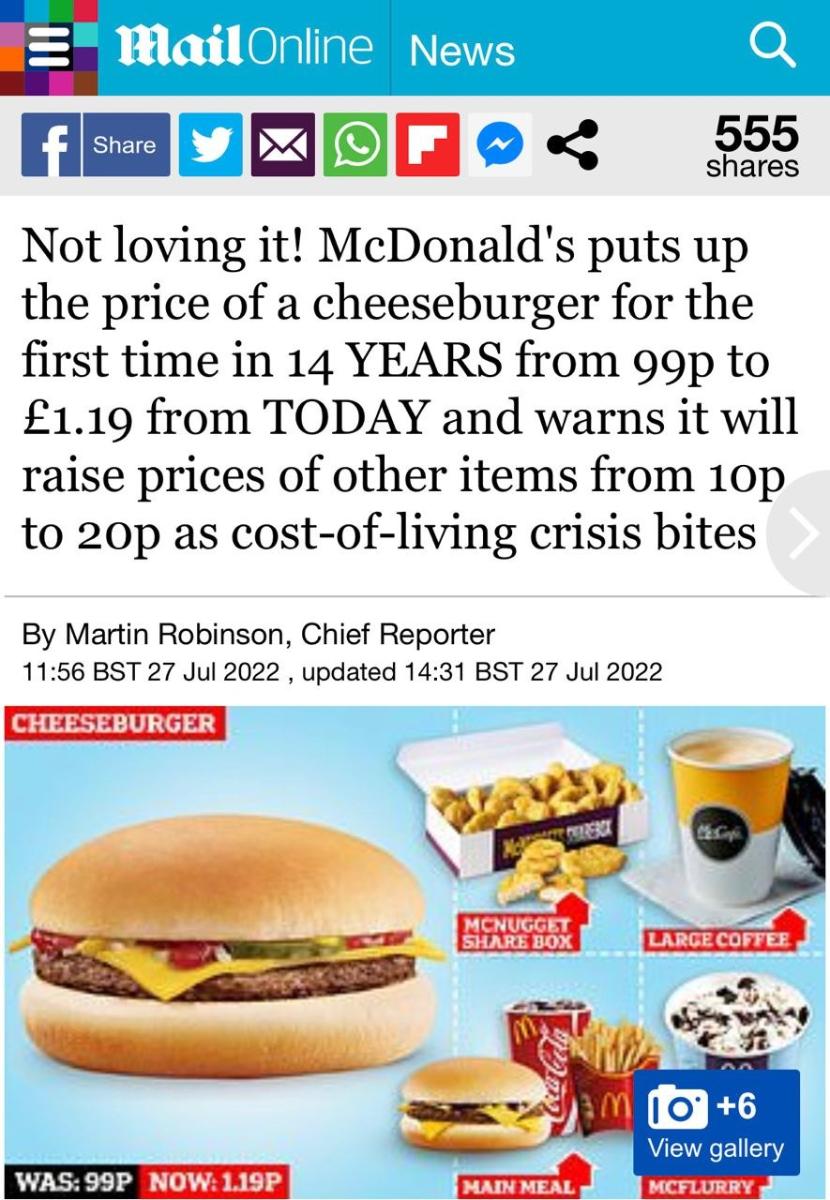 Скорее всего какие-то подвижки на этом направлении мы увидим уже в сентябре, поскольку именно тогда начнёт холодать, а до зимы останутся считанные месяцы. Ну и без этого есть все основания говорить о масштабных переменах. Тревогу бьют посетители британского McDonald's. Как оказалось, руководство фастфуда приняло непростое решение, поднять цены на большую часть блюд. Например, популярный чизбургер с 99 пенсов подскочил до 1.19 фунта (с 1.19 доллара до 1.43 доллара). Такое случилось впервые за 14 лет, а до этого повышение было незначительным. Представители McDonald's уже сообщили, что выбора не было, ведь в сложившихся обстоятельствах без этого выплаты заработной платы оказались бы под угрозой. Новых ценников на остальные блюда в фастфуде пока нет, но уже сегодня известно, что самые недорогие позиции подорожают на 10 пенсов, тогда как популярные – на 20 пенсов.