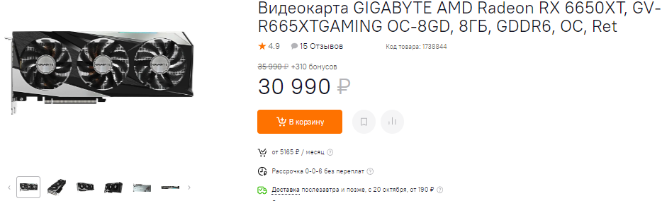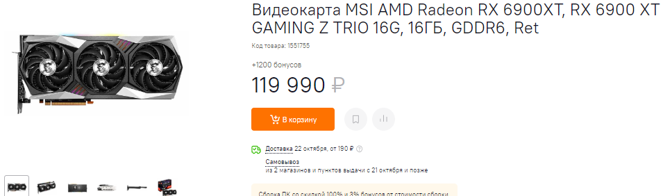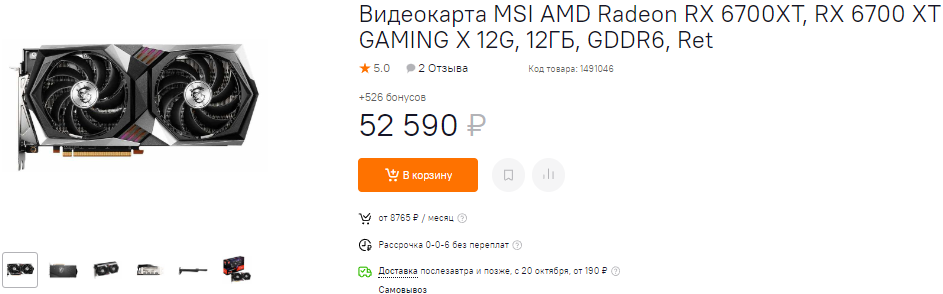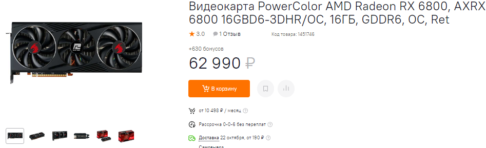 Не дружит с головой и PowerColor, предлагающая нам Radeon RX 6800 за 63 тысячи рублей. Возможно, магазин просто не успел сообразить, что после удешевления Radeon RX 6800 XT до 66 тысяч, никто не купит урезанную Radeon RX 6800 за 63 тысячи. К слову, это весьма неплохая видеокарта, которая способна порадовать самых требовательных геймеров. Она тянет все игры в 4К, хотя не имеет такого большого запаса прочности, как у старших моделей. Ну а пока советуем подождать. Как только цена станет нормальной, можно будет смотреть в сторону Radeon RX 6800.