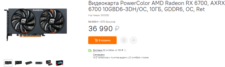 И снова MSI, но на этот раз с видеокартой Radeon RX 6700 XT за 52 590 рублей. Скажите, кто в здравом уме купит такую модель, когда чуть ниже доступна аналогичная от PowerColor за 44 тысячи? Учтите, что обе имеют посредственное охлаждение, которое пусть и справляется с отводом тепла, но не позволяет получить дополнительные бонусы в разгоне. Вообще, Radeon RX 6700 XT – это очень неплохой графический чип, вот только стоить он должен дешевле 40 тысяч. Ну а пока магазины ждут с моря погоды, подождём и мы, ведь есть видеокарты и выгоднее. А есть и хуже. Как вам Radeon RX 6700? Перед нами майнерский графический чип, который несколько производителей так и не смогли распродать шахтёрам. Сегодня PowerColor предлагает нам купить такую карту за 37 тысяч рублей. Отвратительное предложение. Пожалуй, мы воздержимся от такой щедрости.