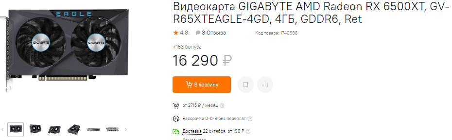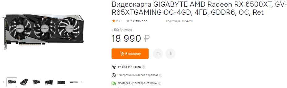 А вот модель от GIGABYTE на графическом чипе Radeon RX 6500 XT выглядит нелепо. Перед нами видеокарта с 64-битной шиной, крошечным кристаллом и незначительным потреблением энергии. Для тех, кто покупает такие карты, важна каждая сотня рублей, а здесь нам предлагают заплатить 19 тысяч, хотя за 16 290 доступна прекрасная модель от той же GIGABYTE. Мы понимаем, что система охлаждения на три кулера стоит чуть дороже, но в данном случае она не нужна. Что до самой Radeon RX 6500 XT, то это видеокарта начального уровня. Она не тянет все игры в 1080р на максимальных настройках графики, поэтому остаётся компромиссом между экономией и доступом к новинкам 2022 года. Такая видеокарта имеем право на жизнь, но обдирать геймеров – это по меньшей мере некультурно.