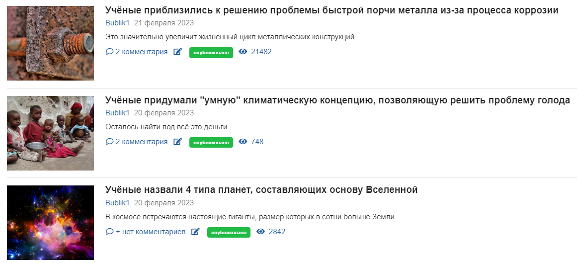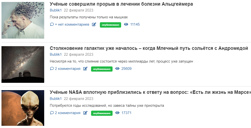 Всего было написано 20 материалов, 1 из которых пошёл в личные. Большая часть получила низкие прочтения до 3000 за несколько суток, но в данном случае нет ничего удивительного, ведь была выбрана научная тематика, которая никогда не отличалась высокой популярностью на нашем сайте. Материал о порче металла набрал почти 22 тысячи просмотров, новость о столкновении нашей галактики с Андромедой заинтересовала 25 тысяч человек, ну а вопрос «есть ли жизнь на Марсе», беспокоит 17 тысяч читателей. В целом, если говорить об успешности, то перед нами посредственные показатели, соответствующие начинающему блогеру, но с учётом сложной тематики и высокой конкуренции на сайте, вышло очень хорошо. Я не слежу за тем, сколько набирают материалы начинающих блогеров, но могу с гордостью заявить, что 3 новости от ChatGPT входили в 20 самых популярных материалов сайта на протяжение 2 суток. Возможно, если бы я уделил делу хотя бы 1 час времени, то результат был бы выше, но задачи получить много прочтений не было.