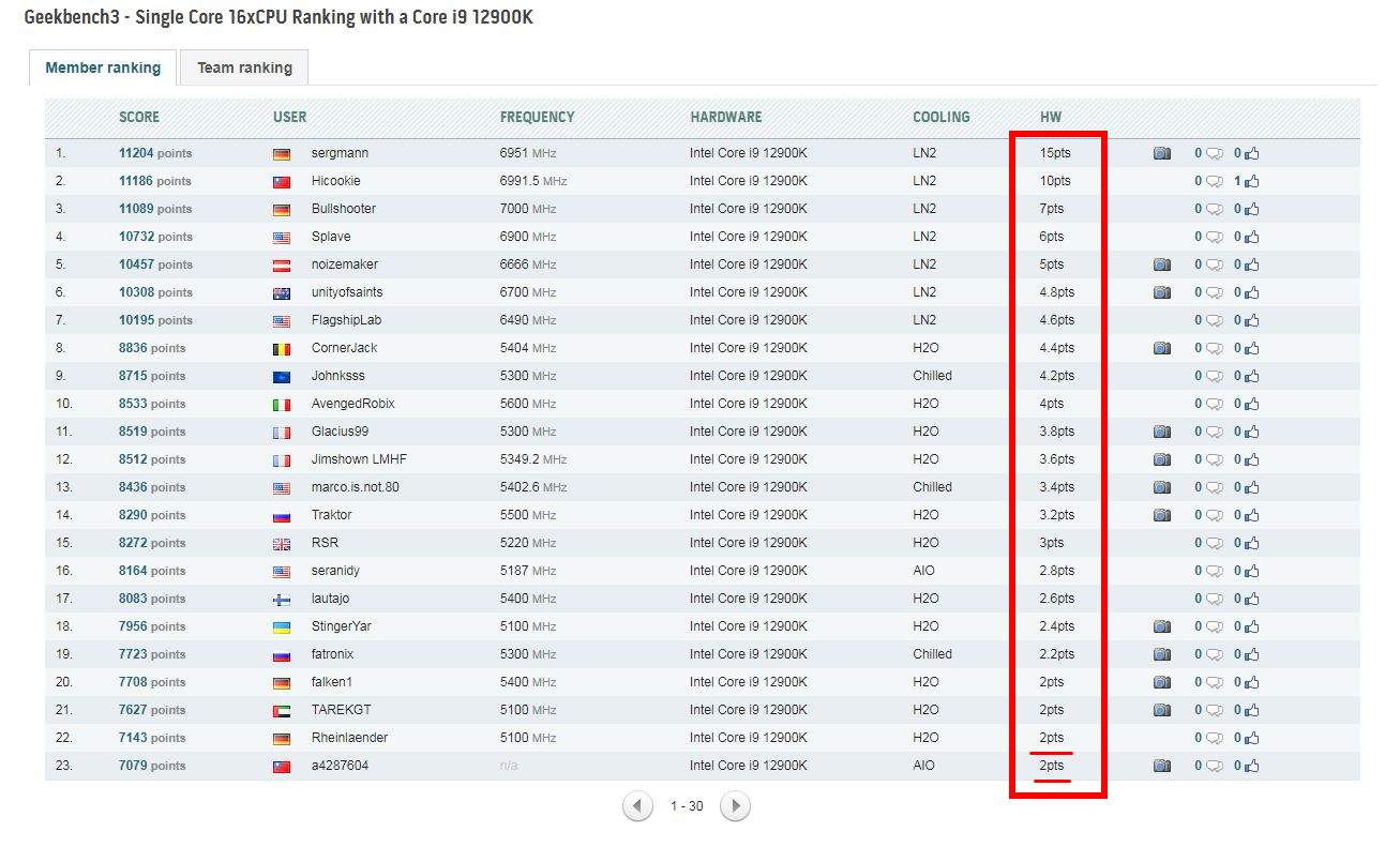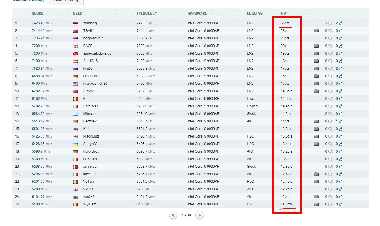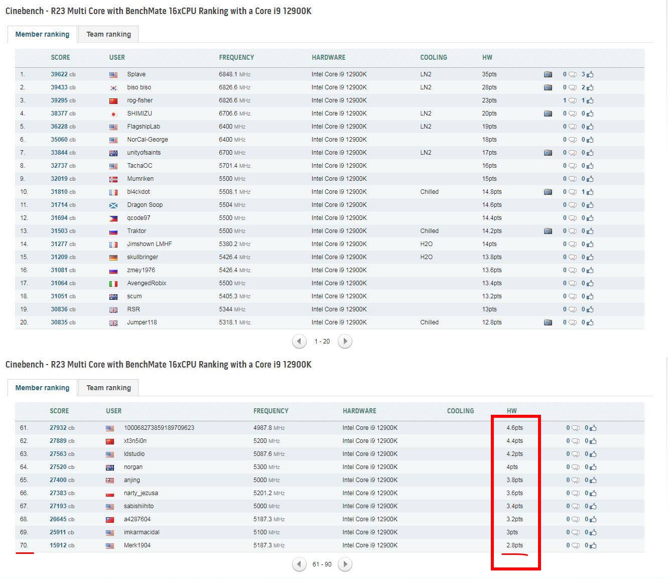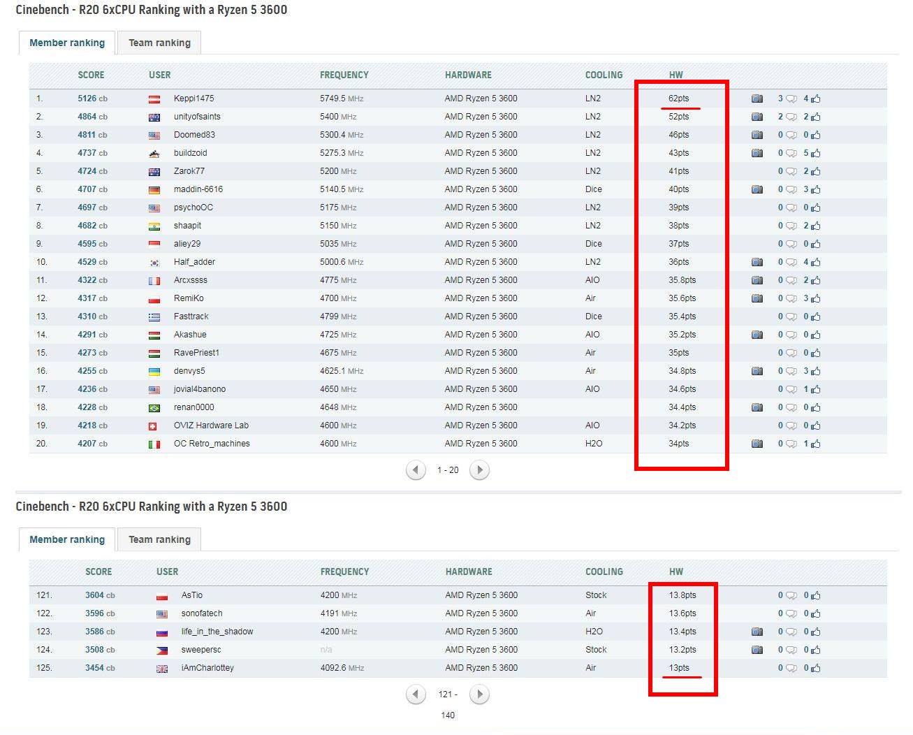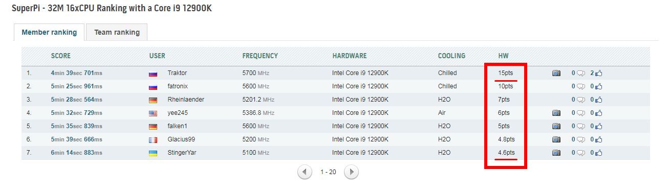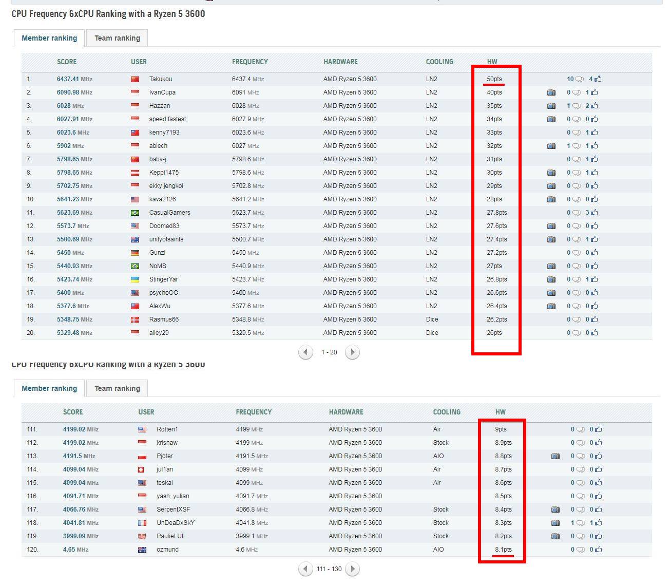 - Если категория была пуста и первый результат 6000 за него дадут 2 pts., за любые следующие результаты не перебившие 1 место, будут давать меньше, все кто ниже 4500 получать 0.2 HW points. Единственный способ увеличить баллы, нужно перебить 1 место. Это был огромный минус, ведь первый результат закрывал популярность данной категории, целесообразность загружать результаты когда за них даёт от 1 до 0.4 pts., даже с использованием LN2.