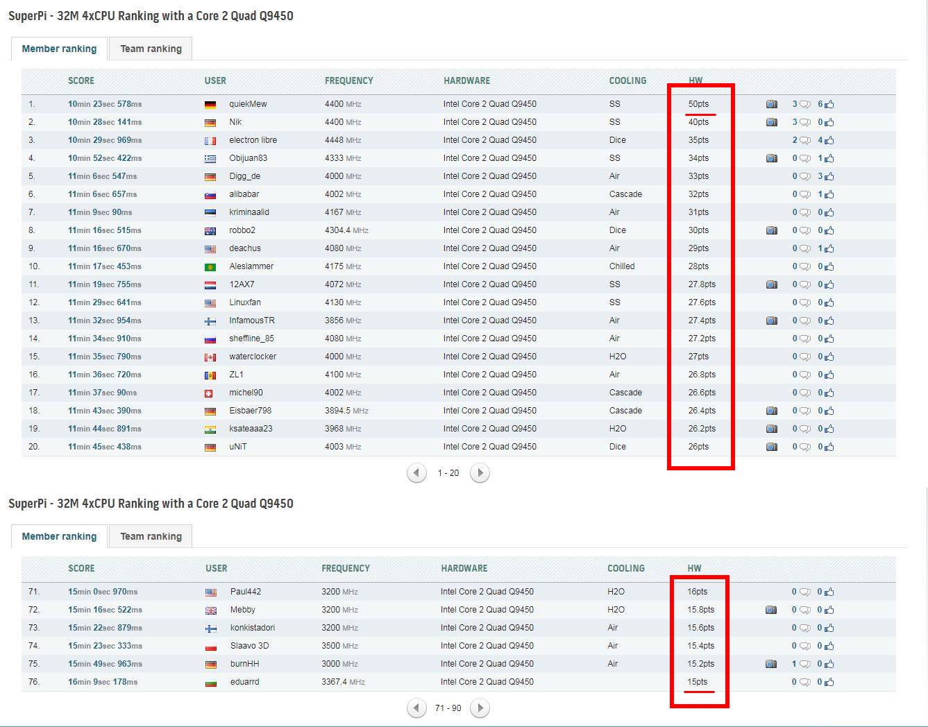 Экскурс по всем системам расчёта начиная c 2005 года я проводить не буду, это не интересно. Все сводились к одному, расчёт вёлся от максимального разгона в какой-то категории, балл увеличивался при смене лидера, был промежуток между максимальным и % минимального разгона от максимального, если вы занимаете любую позицию в данном отрезке вас ни когда не выкинет из рейтинга на позиции за которые дают 0.2 pts., Только если сменится лидер радикально с большим отрывом от второго места, либо же 10 лидеров сбегут вперёд от 11 места. Высокий балл с применением водяного охлаждения можно было получить только при использовании популярного железа и процессоров прошедших отбор. Приведу пару примеров: