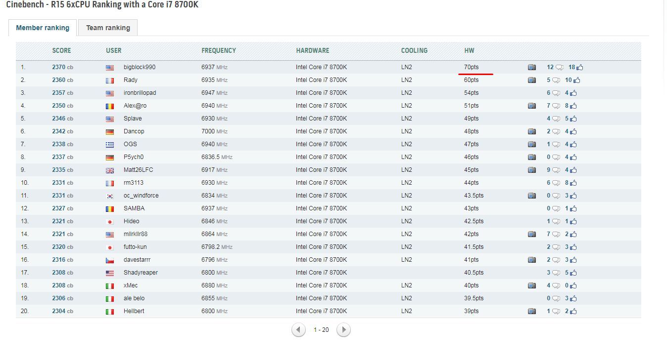 Но она делает популярные процессоры ещё более популярными, где в меру системы подсчёта будут размещать результаты в состоянии downclock, stock, небольшой разгон и получать очень высокий балл. И это на первый момент может казаться не совсем справедливо, так как в категории до 75 результатов, 1 место за разгон с применением LN2 получает 35 баллов, а результат в стоке в категории свыше 181 результата может прекрасно получать 25 pts., это верно на момент подачи данного результата, но со временем, те 35 pts., увеличатся до 70 pts., а эти 25 могут в 2 превратиться.