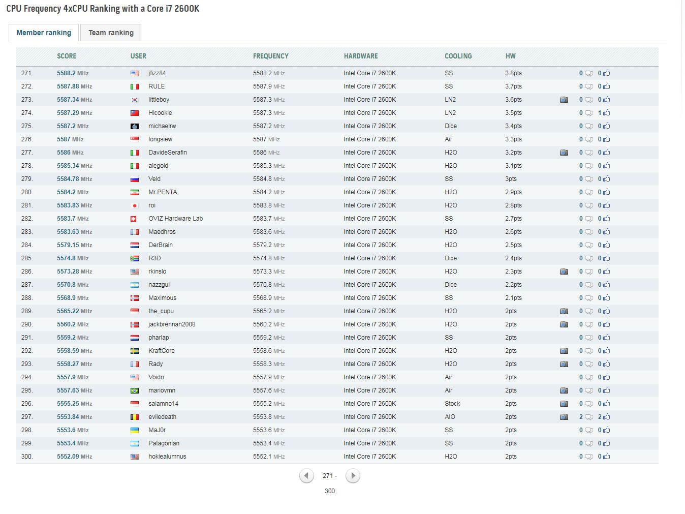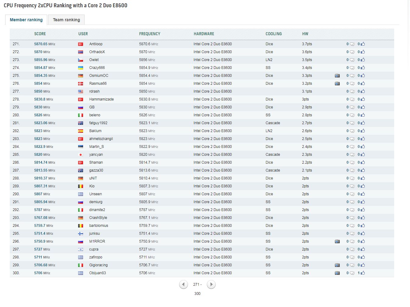 Процессоров и видео карт где в категориях на текущий момент уже есть свыше 287 результатов наверное 2% от общего числа всех процессоров и видео карт существующих. Можно посмотреть скриншоты рейтинга некоторых таких экземпляров, это в основном очень популярное железо. Чтоб получить хотя бы 3 pts., на таком популярном процессоре сокета 775 как Core 2 Duo E 8600, его нужно разогнать минимум до 5840 MHz. То же самое провернуть на популярном процессоре 1155 сокета Core i 7 2600K нужно менее сил всего до 5585 MHz