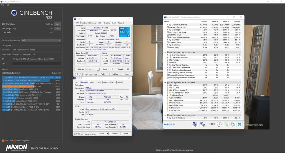 При включении этой опции разблокировки обозревателю удалось успешно увеличить значение BCLK со 102,9 МГц до 131,25 МГц, используя значение множителя 40. В результате Core i5-12400 работал на частоте 5,25 ГГц на всех ядрах. HKEPC сообщает, что разогнанный чип 6C/12T набрал 16205 баллов в многоядерном тесте Cinebench R23, что почти соответствует процессору AMD Ryzen Threadripper 1950X 16C/32T. При этом Core i5 никогда не нагревался выше 89 °C. Однако все дело в охлаждении: его охлаждал очень мощный кулер Cooler Master MasterLiquid PL360 Flux AiO.