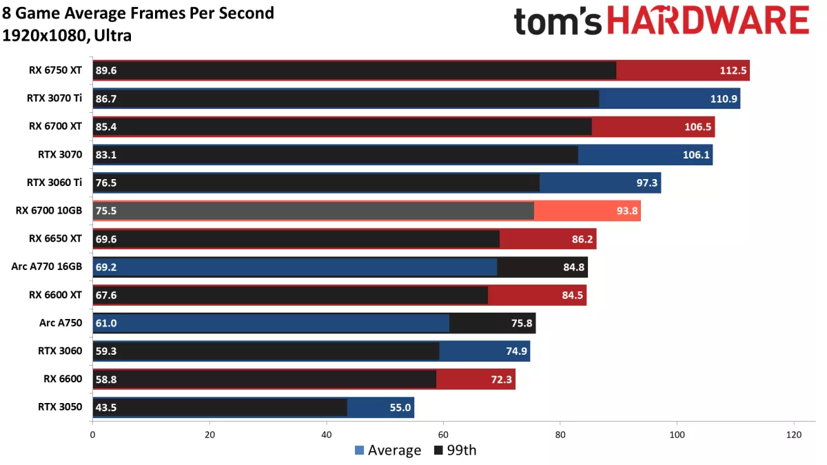 Карта Sapphire ненамного быстрее, но дополнительная видеопамять, пропускная способность и вычислительные ресурсы дают ей преимущество на 9% по сравнению с 6650 XT и на 30% по сравнению с RX 6600. Она стоит примерно на 20% дороже, чем самая дешевая 6650 XT и на 58 % дороже, чем RX 6600. Также, если сравнивать с Arc A750, то RX 6700 на 24% быстрее, по крайней мере без трассировки лучей.