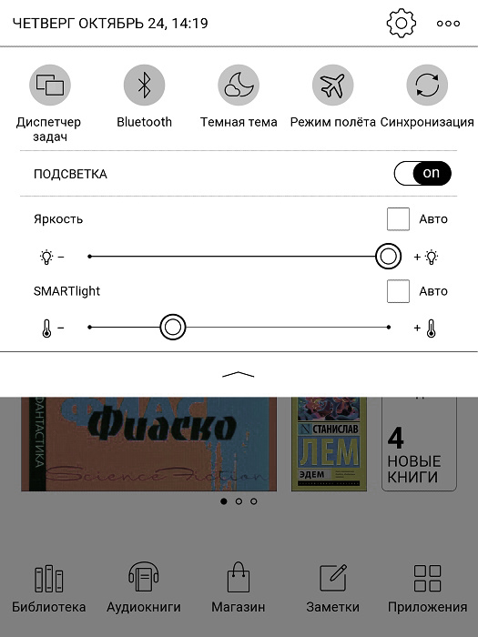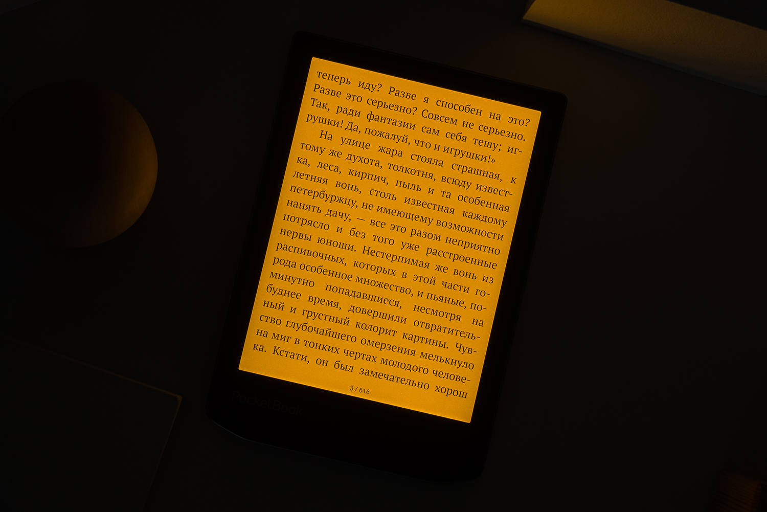 Здесь же скажу пару слов про подсветку. Она типичная для ридеров ценой от 10 тысяч рублей: можно регулировать и яркость, и цветовую температуру. То есть доступен и белый цвет, и масса оттенков желтого и оранжевого. Последние, как принято считать, обеспечивают расслабляющий эффект. Поэтому при чтении перед сном логично задействовать именно их. Но и днем лично я порой ставлю желтую подсветку. Благодаря этому страницы книг выглядят «теплее и ламповее», будто читаешь какой-нибудь старинный томик из закромов библиотеки.