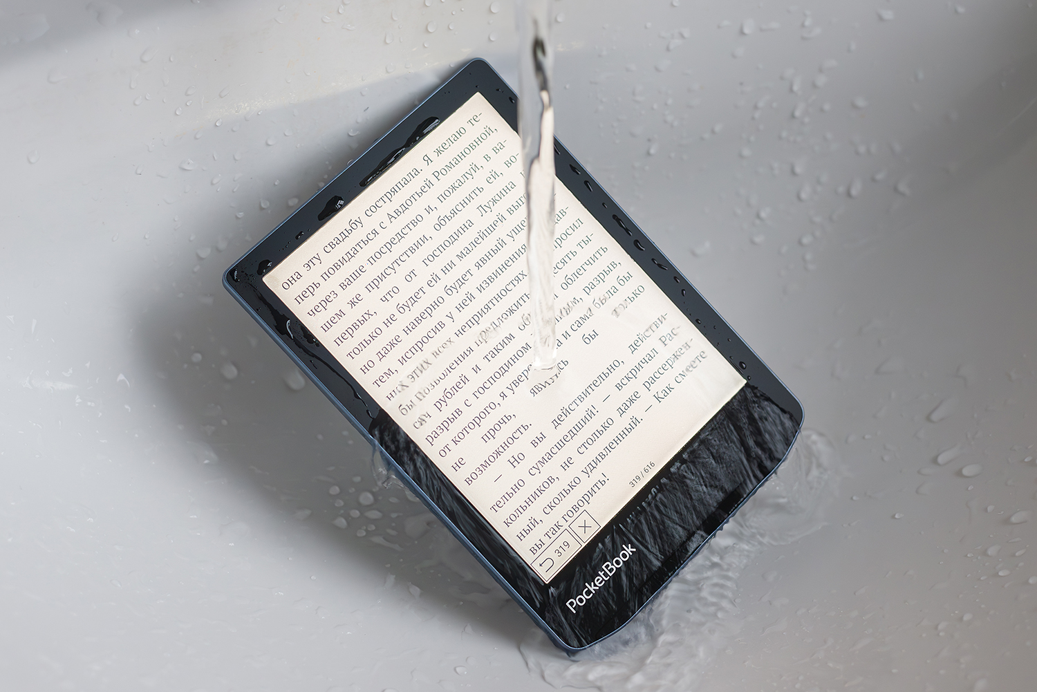 Одной из важнейших фишек PocketBook 634 Verse Pro Color является защита от воды по стандарту IPX8. Устройство можно мыть под проточной водой и ронять в водоемы на глубину до 2 метров. Подчеркну, что эта фишка уникальна для российского рынка – другие производители ридеров реализацией водозащиты не заморачиваются.
