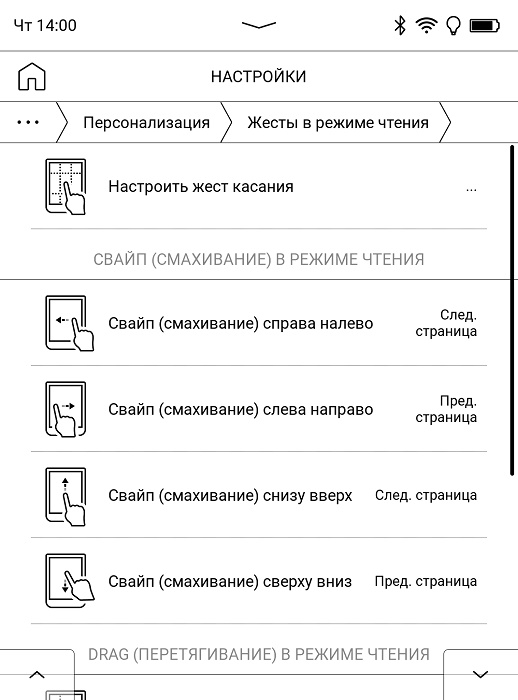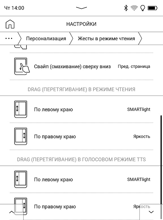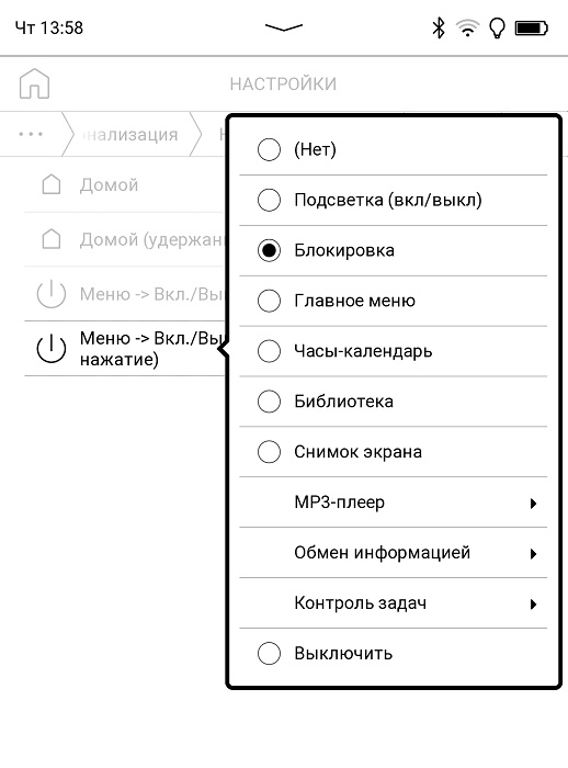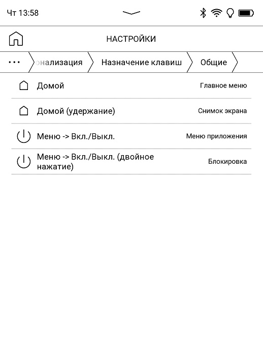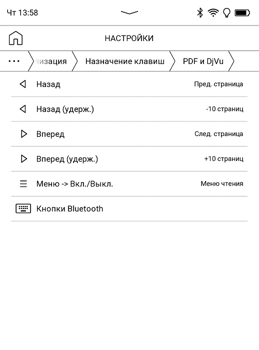 Клавиши в PocketBook 634 Verse Pro Color тоже поддаются тонкой настройке – как для интерфейса, так и для отдельных типов файлов. Таким образом можно ювелирно подогнать систему управления устройством под себя.