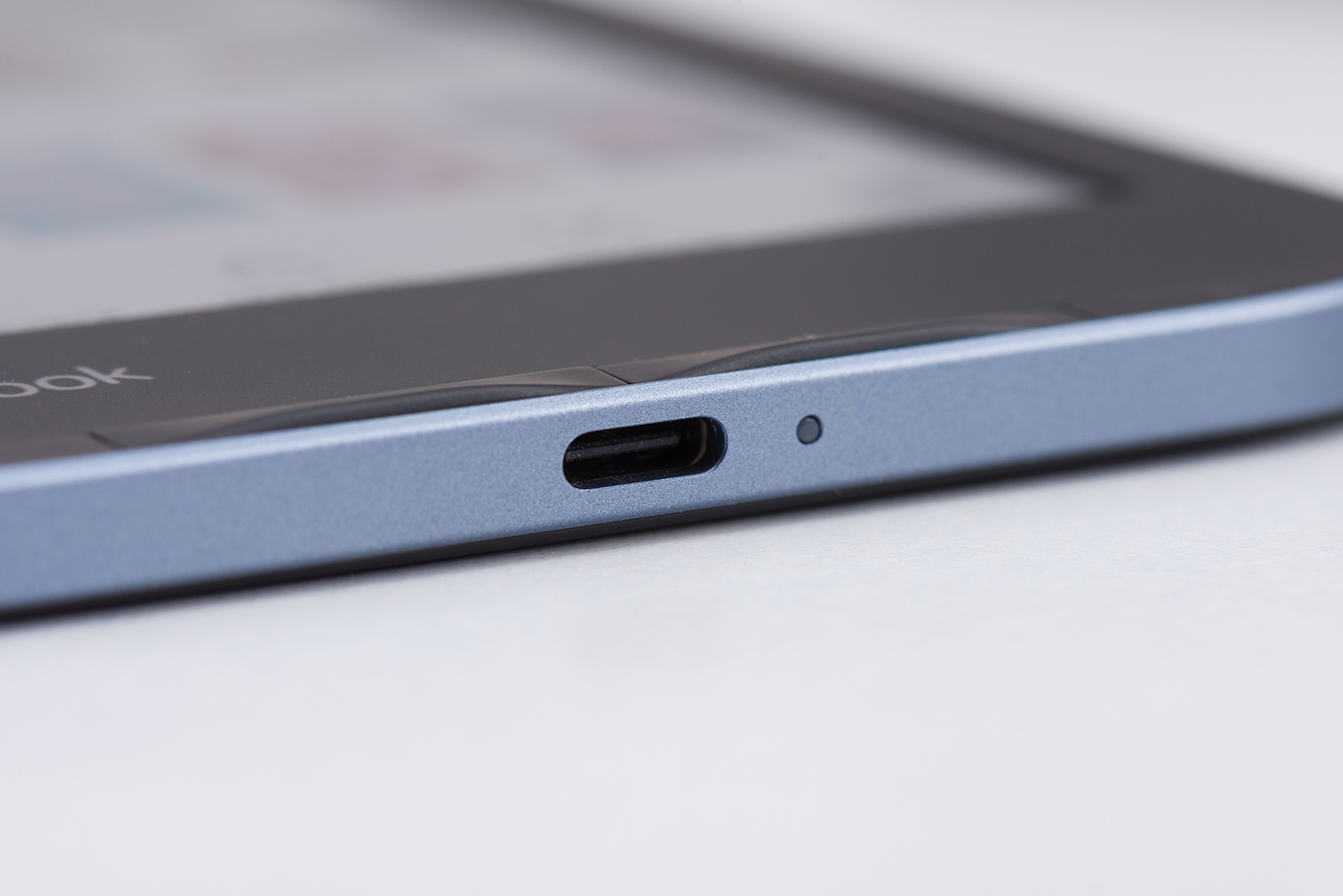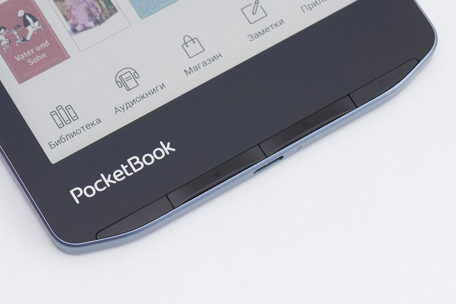 Дисплей слегка утоплен во фронтальную панель, то есть защитного стекла здесь нет – это удел более дорогих моделей вроде той же PocketBook 700 Era Color, PocketBook 743G InkPad 4 и некоторых других. Никаких неудобств это, впрочем, не доставляет: управлять устройством с помощью тачскрина вполне удобно.