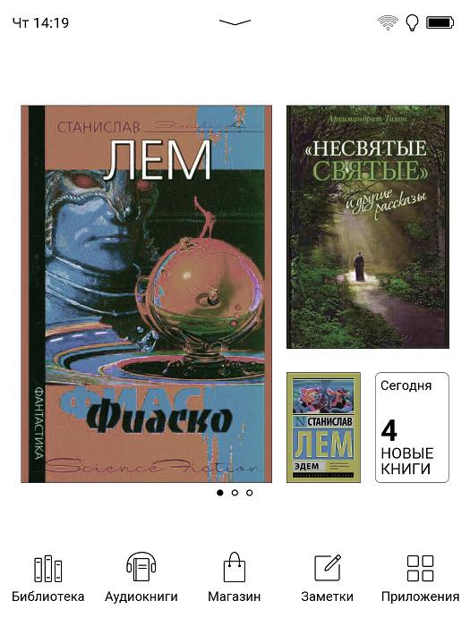 Встречает нас рабочий стол с обложками книг – тех, что открывались последними. Если вы недавно добавляли какие-то файлы в память и пока не открывали их, демонстрируется соответствующая плашка. Ниже есть иконки быстрого доступа в количестве пяти штук. Четыре из них можно менять на какие-либо другие приложения.