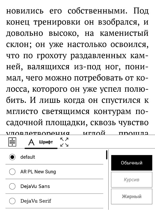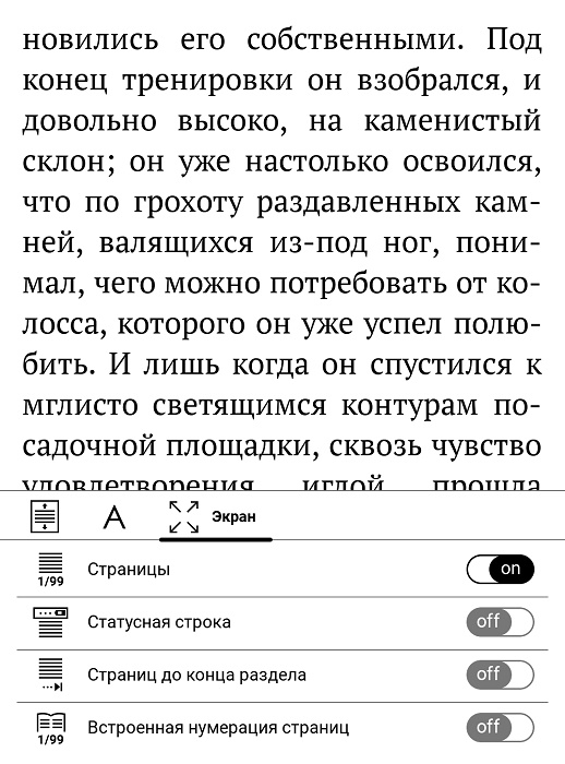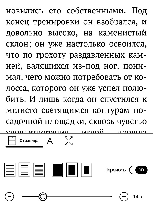 При открытии книг доступна масса опций – встроенные в систему шрифты (плюс можно добавлять свои), размер букв, поля, межстрочные интервалы, темная тема, ну и так далее.